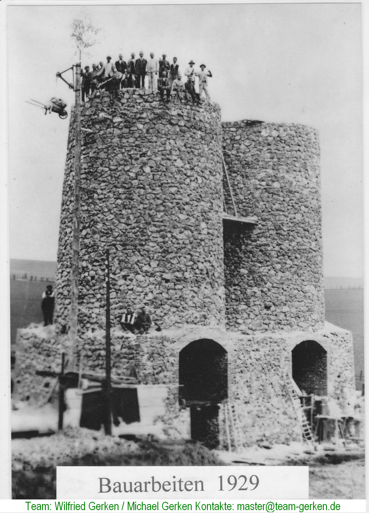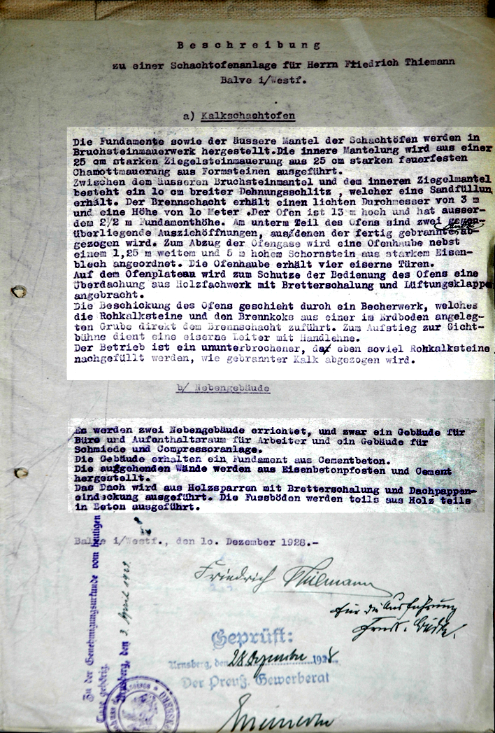 Im Dezember 1928 verfasste er einen Bauplan für ein neues Kalkwerk auf dem Mamorstock des Kreisdeputierten Wilhelm Hörster in Eisborn-Horst. Der Gewerbeeintrag erfolgte in Balve am 03.01.1929. Nach damaligem Recht konnte er dann mit dem Bau der beiden ersten Öfen beginnen. Schon 1930 setzte er einen dritten Ofen daneben. Das Mauerwerk der Öfen wurde (wie auch heute noch üblich) aus vier Schalen mit verschiedenen Steinsorten errichtet. Das äußere Mauerwerk besteht aus Bruch –bzw. Beton Formsteinen mit einer Dicke von 100 bis 180 cm. Dann folgen zwei 24 bzw. 12 cm starke Ziegelsteinschichten, die durch eine 10 cm breite mit Sand gefüllte Dehnfuge getrennt sind. Diese Steinschichten bilden das Dauerfutter des Ofens und gewährleisten seine mechanische Stabilität. Das Dauerfutter wurde nach innen mit einem 24 cm dickem Mauerwerk aus feuerfesten Schamottesteinen vor der Gluthitze geschützt. Dieses Schleißfutter aus Schamotte kann sehr lange halten, wenn der Ofen möglichst gleichmäßig ausgelastet wird und keine Brennstoffnester die Schamottesteine zum Schmelzen bringt. Dann sagt der Kalkwerker: „ Der Ofen hat rote Backen!“ Die Höhe der Öfen beträgt ca. 13 m, am Fuß ist der Durchmesser ca. 8 m und verjüngt sich zur Ofenbühne auf ca. 6 m. Der eigentliche Brennraum hat einen Innendurchmesser von.ca 3 m und einen Höhe von ca. 10 m