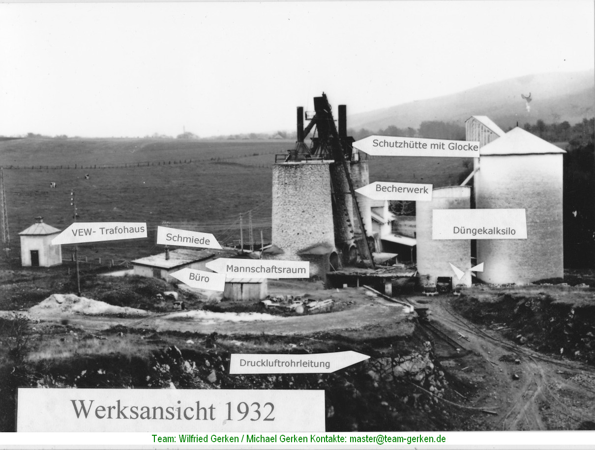 Das Kalkwerk wurde immer weiter ausgebaut. Aber die Anforderungen der Kalkabnehmer änderten sich mit der Zeit. Die Belegschaftsstärke betrug durchschnittlich 30 Mann. Gearbeitet wurde einschichtig. Die Öfen wurden von 6.00 bis 16.00 Uhr beschickt. Das Abziehen des Kalkes von 5.00-9.00 Uhr und von 16.00-18.00 Uhr. Dadurch lag das Feuer in den Öfen nie gleichmäßig. Montags morgens krabbelte das Feuer schon an der Gicht.