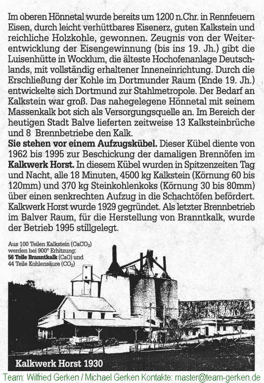 Ein Aufzugskübel des Kalkwerks Horst steht in Balve, An der Kormke Ecke Hauptstraße. Dieser Kübel diente von 1962 bis 1995 zur Beschickung der damaligen Brennöfen im Kalkwerk Horst. In diesem Kübel wurden in Spitzenzeiten Tag und Nacht, alle 18 Minuten, 4.500 kg Kalkstein (Körnung 60 bis 120mm) und 370 kg Steinkohlenkoks (Körnung 30 bis 80mm) über einen Senkrechtaufzug in die Schachtöfen befördert. Kalkwerk Horst wurde 1929 gegründet. Als letzter Brennbetrieb im Balver Raum, für die Herstellung von Brantkalk, wurde der Betrieb 1995 stillgelegt.