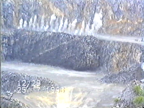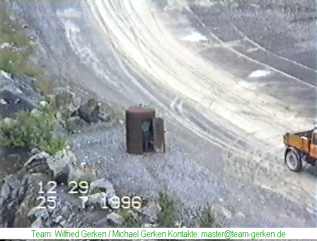 Die drei mit einem Horn geblasenen Sprengsignale sind wie die Sprengung selbst deutlich zu hören. Der Sprengmeister beobachtet dies aus dem Zündbunker, der im einerseits Schutz gibt und andererseits durch Sehschlitze den Blick auf den Sprengbereich ermöglicht.